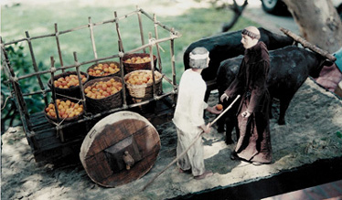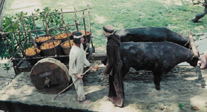 filled with baskets of oranges pulled by the oxen. The padre and his worker