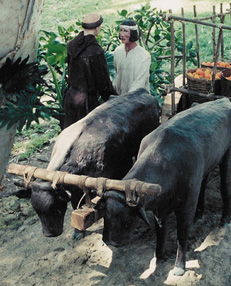The oxen's horns are lashed to the yoke with the drawbar